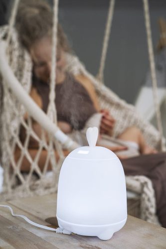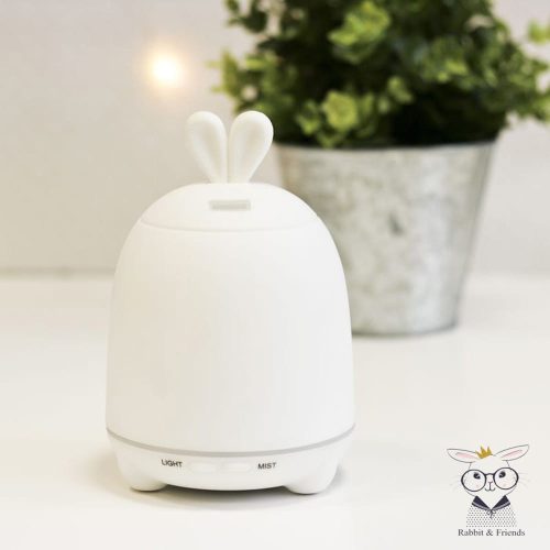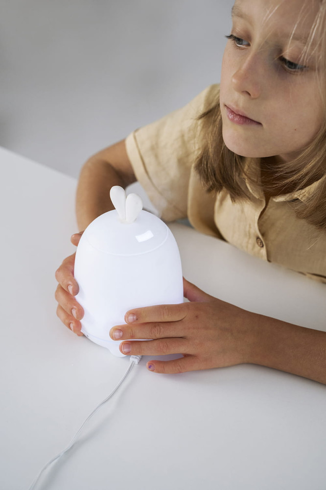 A Rabbit & Friends DIFFUSER lámpa nyúlfülekkel a levegő párásítás és az aromaterápia számos előnnyeivel jár. Ez egy bevált módszer a páratartalom javítására a gyermekszobában. A készülék által keltett hűvös pára kellemes és biztonságos. A változó színű LED lehetővé teszi a diffúzor kényelmes éjszakai működtetését. A diffúzoros lámpa egészséges, kellemes és kényelmes alvást jelent minden gyermek számára.