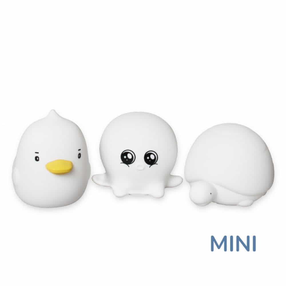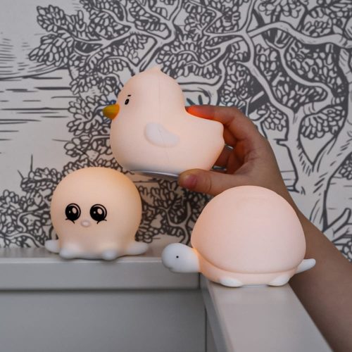 A 3 mini lámpából álló készlet bájos kacsa, polip és teknős sok örömet okoz a gyermekeknek. Egyedülálló dísze a gyermekszobának, elkíséri őket alvás közben vagy éjszakai séták során a szülőkhöz.