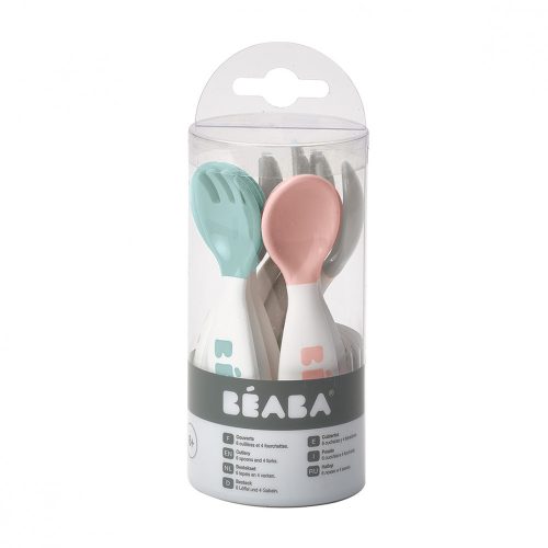 Béaba Tanuló Kiskanál és Villa szett - 6 kanál és 4 villa (Vegyes színek: Sötét rózsaszín + Friss zöld + Halvány szürke)