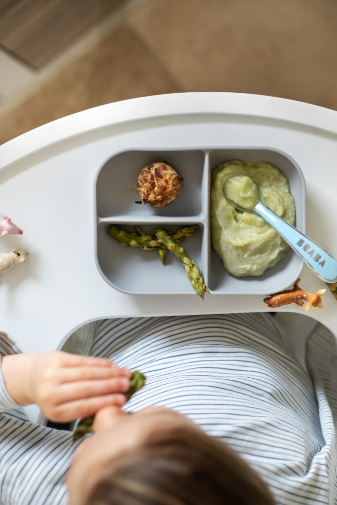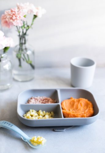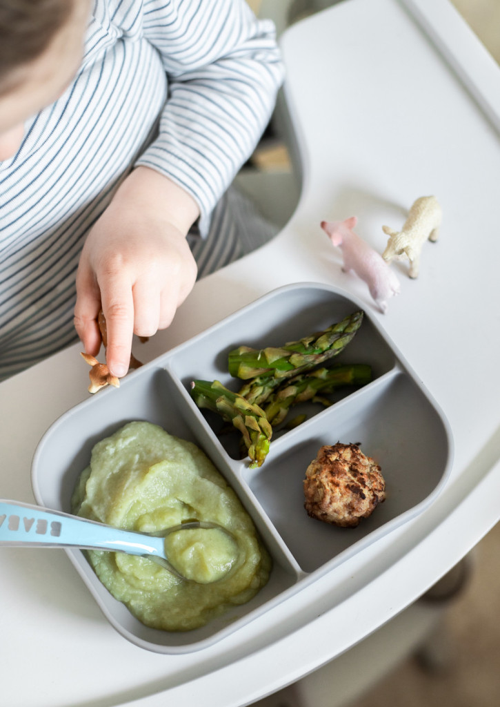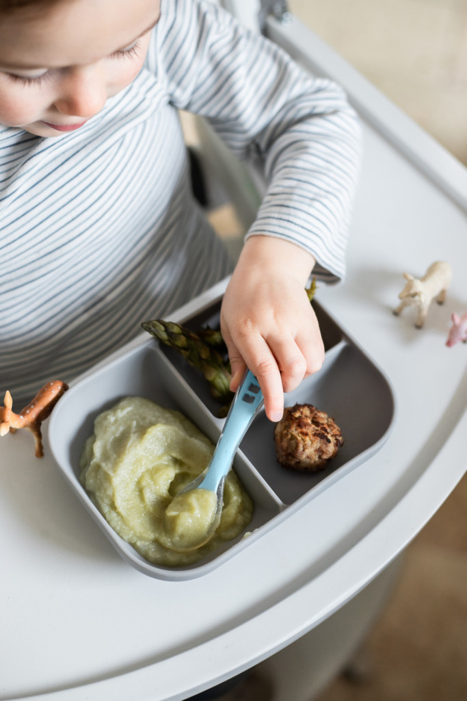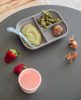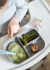 Szilikon étkészlet, amely egy 3 külön részre felosztott tányért és egy "2nd age" kanalat tartalmaz.