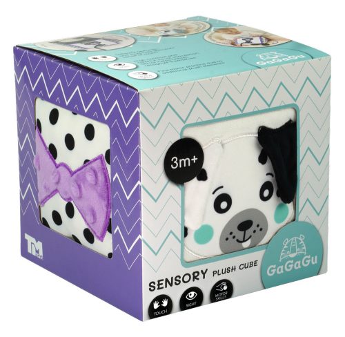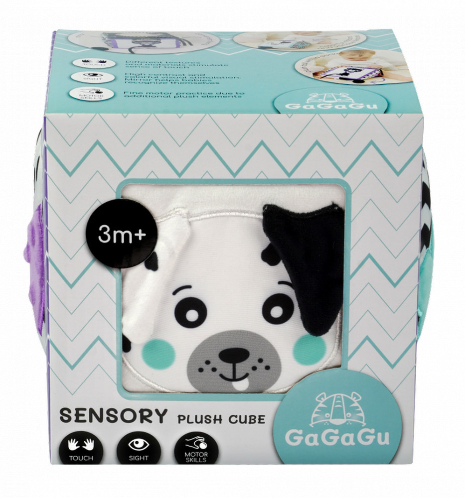 A GaGaGu kocka kontrasztos színű és mintájú, ami serkenti a csecsemő látását. A kocka minden oldala teljesen más, más (különböző szerkezetű) anyagokból van varrva, ami 6 teljesen eltérő érzékelési élményt ad – mind látásit, mind tapintásit. A kocka két oldala állatok elálló elemeit tartalmazza – egy Kutyus füleit és egy Cica farkát – a gyermek megismeri az anyagok különböző szerkezetét, és megfoghatja az elálló elemeket, gyakorolva a finom motorikát. A következő plüss oldalon egy zseb található egy madzagra kötött labdával – ez az elem kedvet csinál a gyermeknek a labda megragadására és be/kirakására a zsebbe/zsebből – ez segíti az ún. finom motorika gyakorlását és a mozgáskoordináció tanulását. Egy másik plüss oldalon egy tükör található, amely felkelti a csecsemő figyelmét, kedvet csinál a kocka megragadására és saját tükörképe megismerésére. Egy megint másik oldalon szalagocskák vannak felvarrva, amelyek szintén a finom motorikát stimulálják. A játék nagyon könnyű és kézreálló, könnyen tárolható, ideális arra, hogy magunkkal vigyük egy sétára vagy utazásra. Nem tartalmaz műanyag elemeket, szalagok segítségével rögzíthető a kiságyhoz vagy babakocsihoz. 3+ hónapos kortól alkalmas a gyermekeknek, és egyike a GaGaGu márkanév alatt kapható 12 terméknek. A kockákon kívül kaphatóak susogók, csörgők, spirál, függők, szenzorikus könyvek és szenzorikus szőnyeg. A GaGaGu sorozatba tartozó összes játék kombinálható egymással.