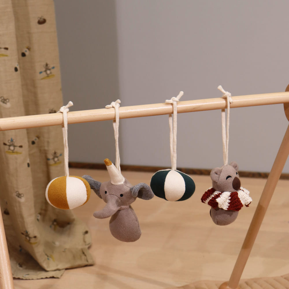 Szórakoztasd a kicsiket ezekkel a puha, kedves,kis fejlesztő játékkal. 100% organikus pamut kötött anyagból készült, újrahasznosított poliészter töltettel. Ideális a tevékenységközpontra.A gyermekülésre vagy a játszószőnyegre akasztva is kiváló kiegészítő is lehet.
