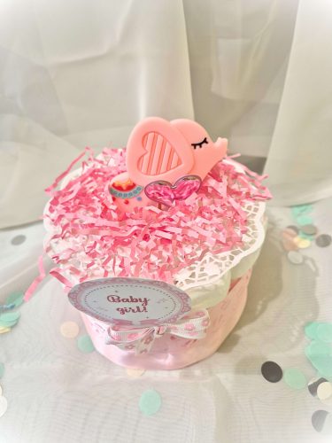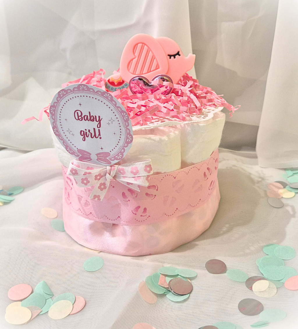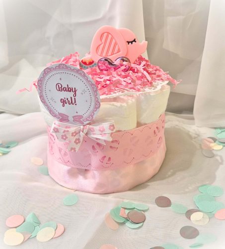 Ez a mini rózsaszín pelenkatorta egyszerre esztétikus és hasznos ajándék minden újdonsült anyuka számára. Megbízható minőségű pelenkákból áll, melyet szilikon rágókával, élénk színű szalagokkal díszítettünk, mely kiváló apró babaköszöntő ajándék, mindig különleges hangulatot teremt a babaváró eseményen.