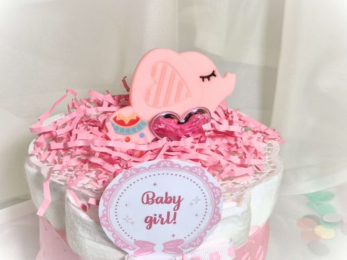 Elefántos mini pelenkatorta rózsaszín rágókával kislányoknak babalátogatóba