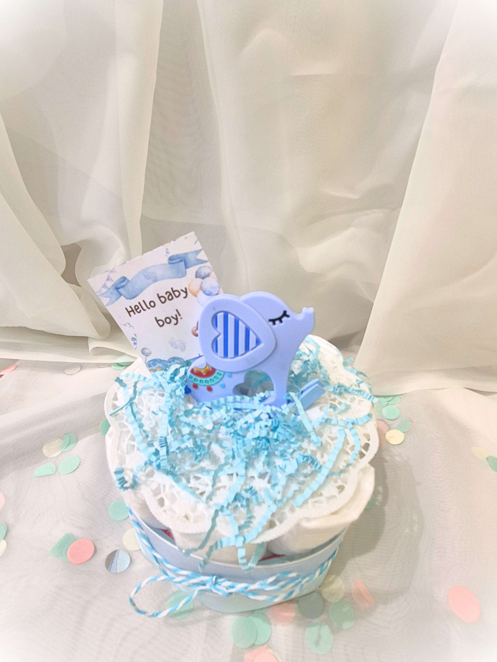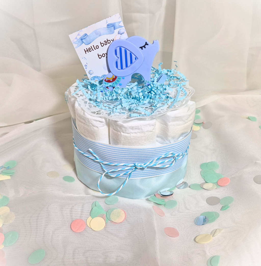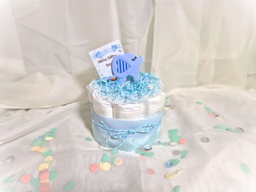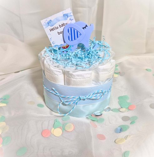 Ez a mini kék pelenkatorta egyszerre esztétikus és hasznos ajándék minden újdonsült anyuka számára. Megbízható minőségű pelenkákból áll, melyet szilikon rágókával, élénk színű szalagokkal díszítettünk, mely kiváló apró babaköszöntő ajándék, mindig különleges hangulatot teremt a babaváró eseményen.