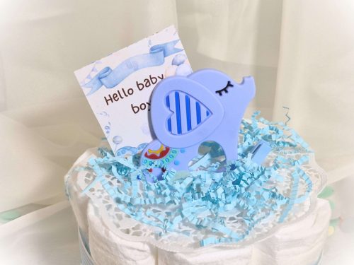 Elefántos mini pelenkatorta kék rágókával kisfiúknak babaköszöntőre